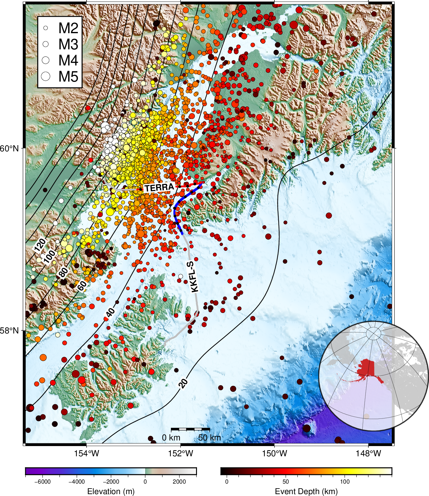 Two seafloor telecommunication cables owned by the GCI Communication Corporation are used that originate from the landing station in Homer, Alaska: the Terrestrial for Every Rural Region (TERRA) runs westward to the Iliamna Bay, near Augustine Volcano, and the southern span of the Kodiak Kenai Fiber Link (KKFL‐S) that connects Kenai peninsula and the Kodiak archipelago. Beginning June 2023, both cables have been connected to a Sintela Onyx v1.0 interrogator unit in the GCI landing station for continuous data acquisition. The team has built a heterogeneous edge unit with a Network‐Attached‐System (NAS) for year‐long continuous data storage (∼160 TB), and two CPU and GPU edge computing servers for data processing. The interrogator unit saves the raw data at a 25 Hz sampling rate and further decimates it into 2.5 Hz; both raw and decimated data are saved. There are 8,531 channels using a 9.47 m channel spacing with a gauge length of 23.93 m between September and December.
