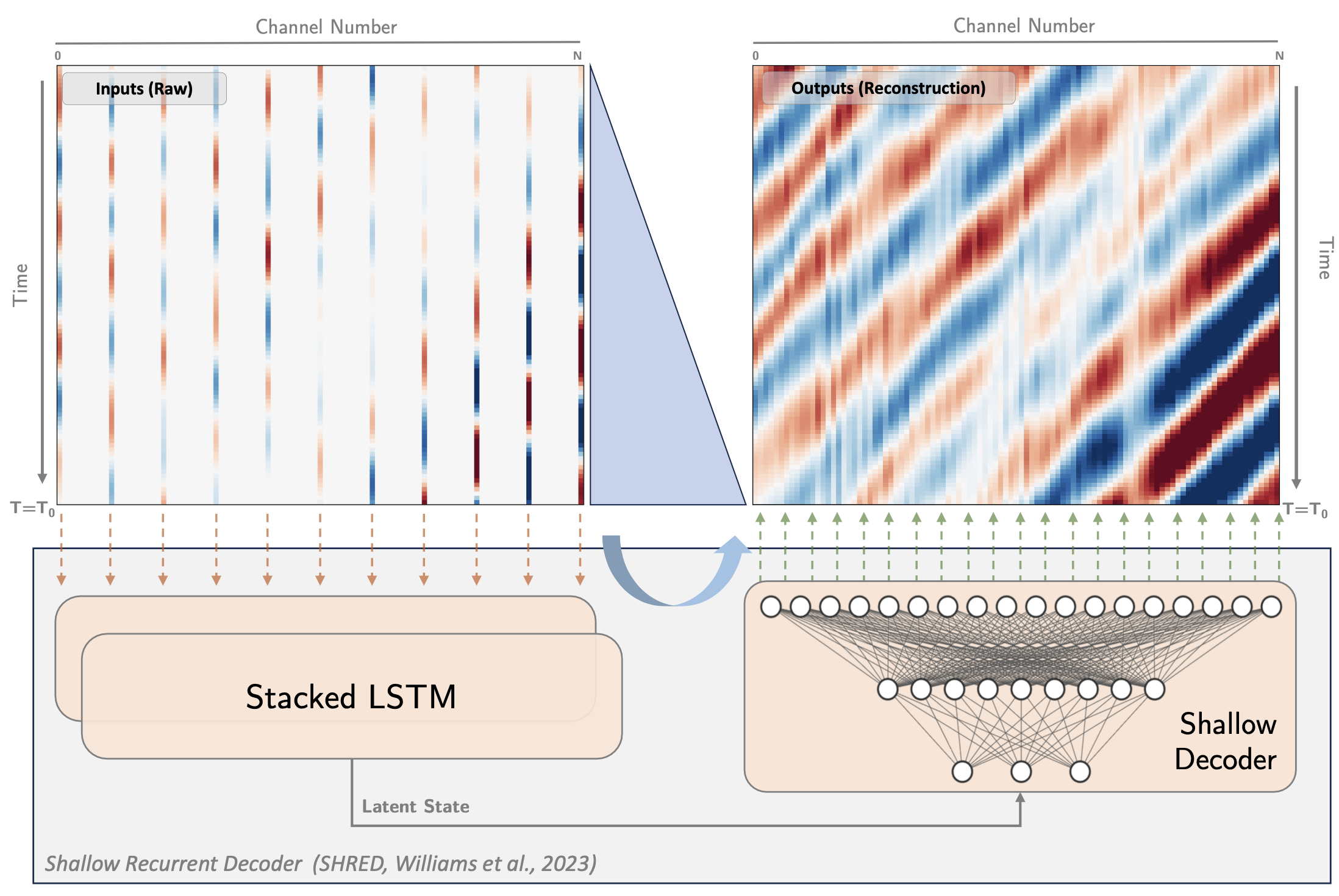 SHRED was designed to take a short time series (sensory temporal trajectory) of a field sampled on a sparse network and reconstruct the current state of the field in a dense, spatial array. The adapted SHRED model takes inputs as the strain rate time series measured before and at the current time \(T_0\) from \(N_{input}\) channels and reconstructs the spatial wavefield snapshot at time \(T_0\) of \(N_{output}\) continuous channel, from which the inputs are decimated.